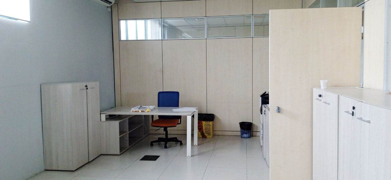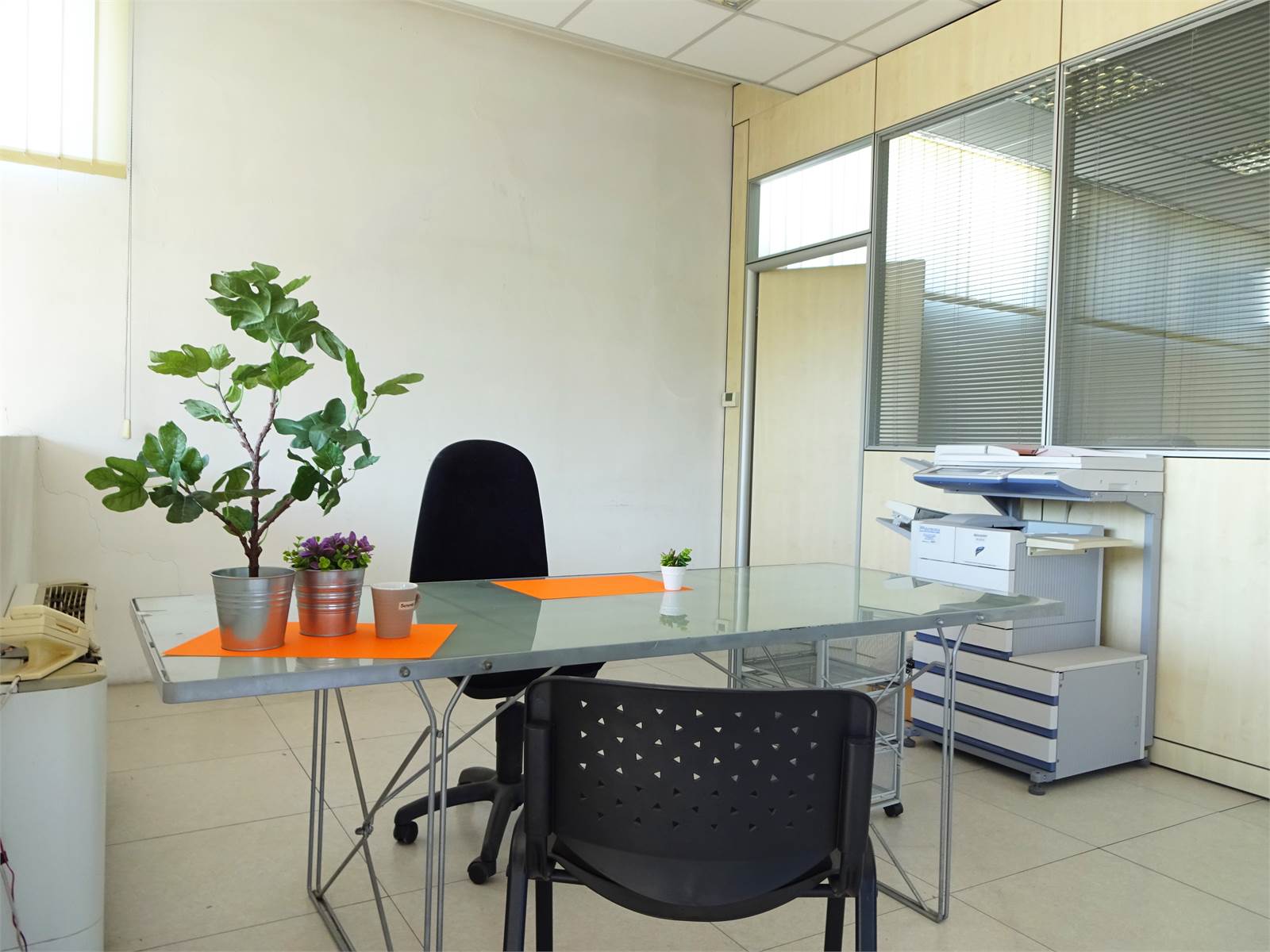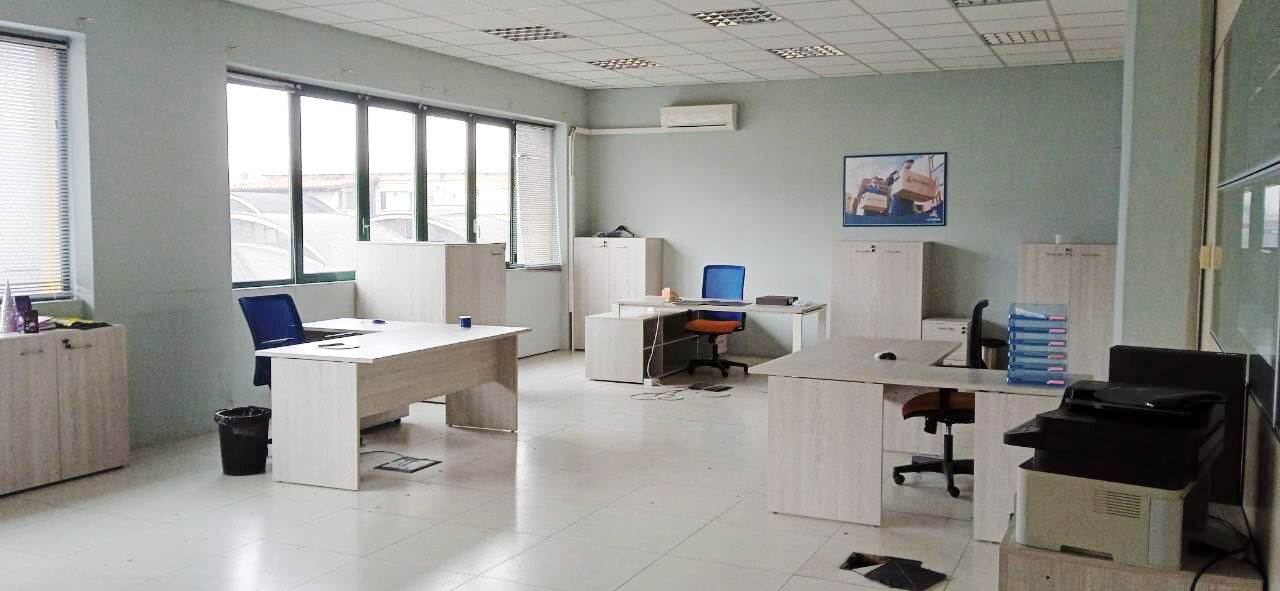 Le pareti di separazione tra il corridoio e gli uffici sono eleganti e in buone condizioni, con veneziane interne ai vetri.