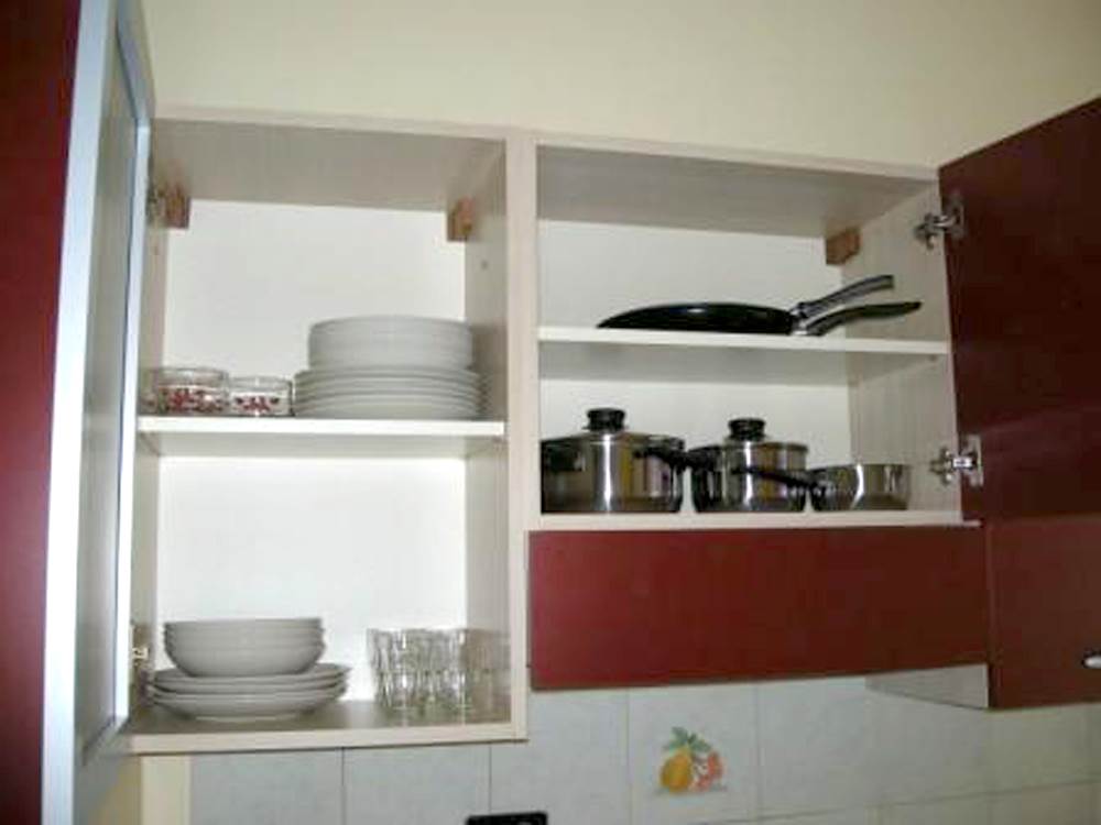 Cucina con una base di piatti, posate, pentole. Lavatrice.