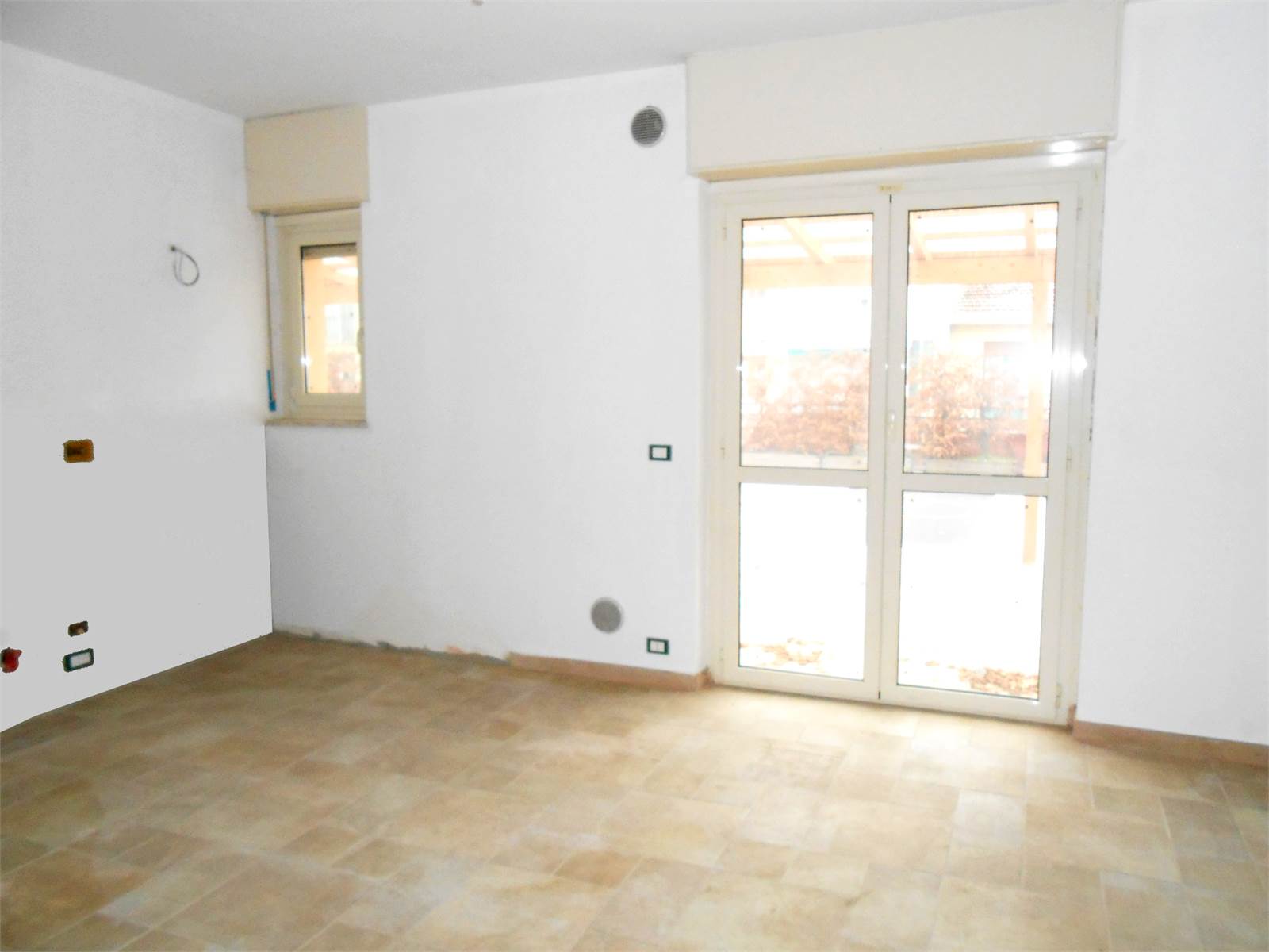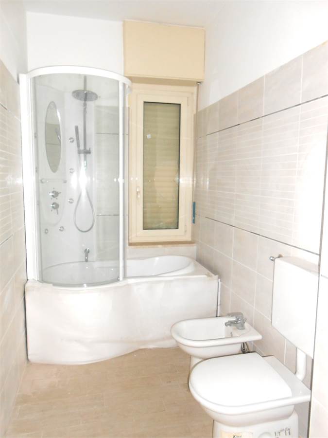 Ingresso su salone, cucina abitabile, due camere da letto, bagno principale con vasca, secondo bagno con doccia e spazio per la lavatrice.