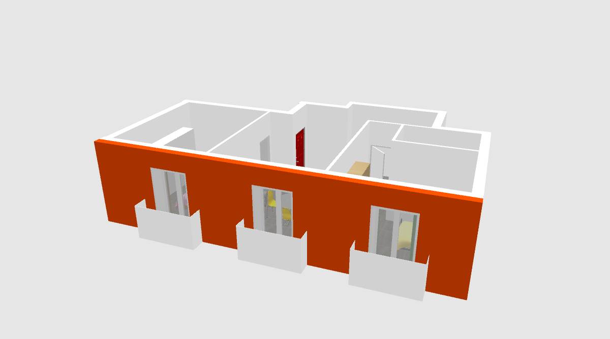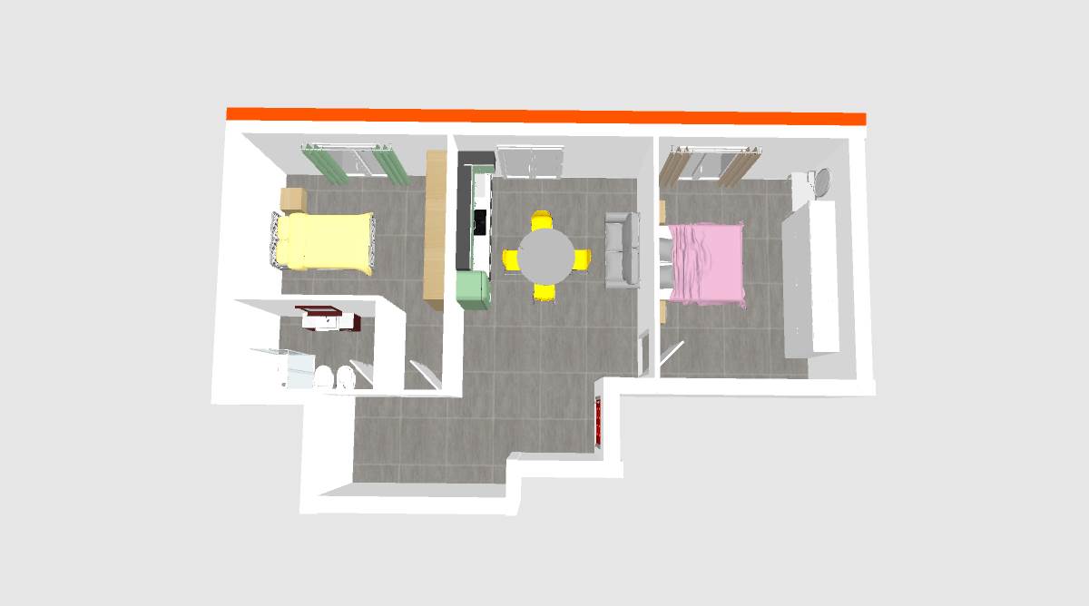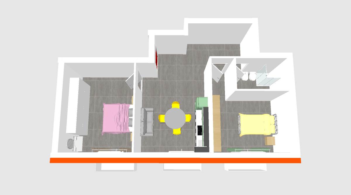 L'appartamento si compone di ingresso, zona giorno, due camere da letto e un servizio.