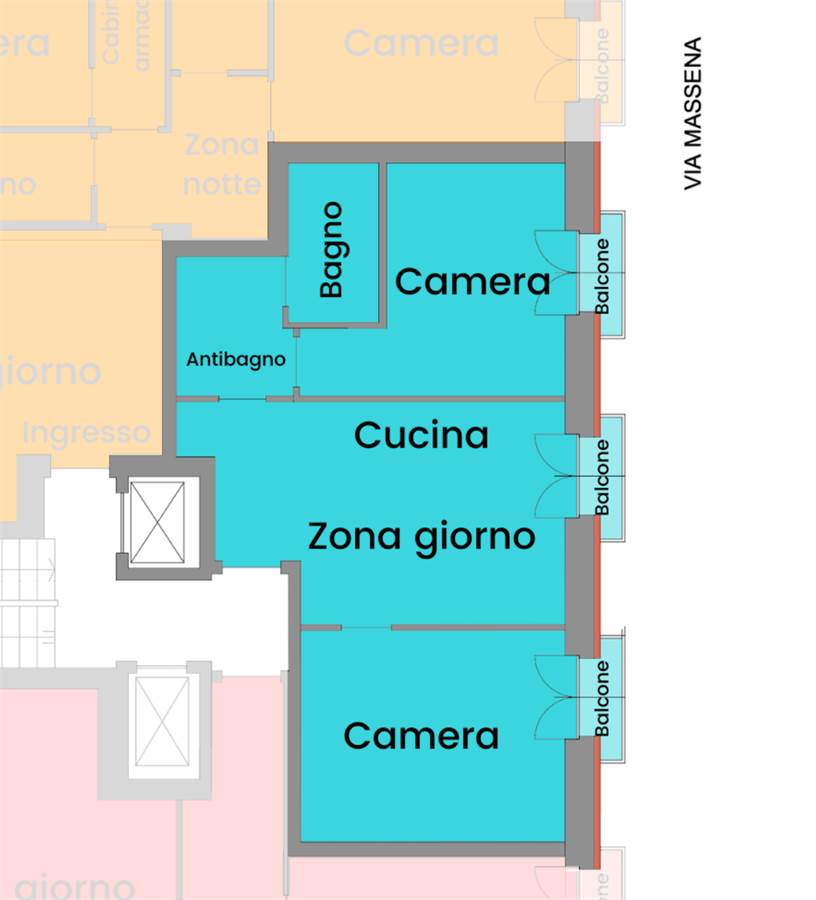 Ci sono tre balconi che si affacciano su Via Massena.