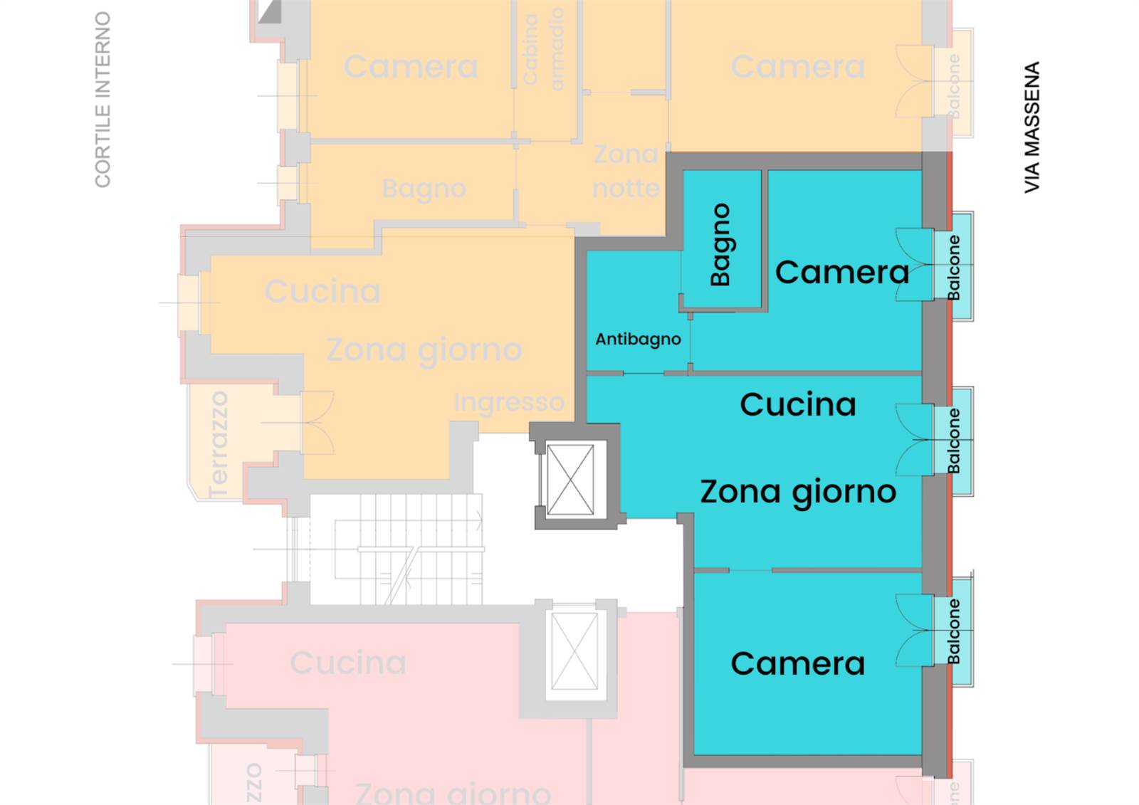 - Immobile accessibile (nessuna barriera sull'ingresso da Via Massena; montascale sui due ingressi; ascensori a norma disabili su ogni scala)